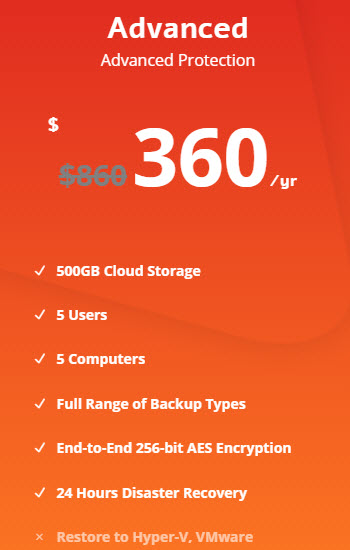 Cloud Backup Advanced Plan includes all the features shown in the table.